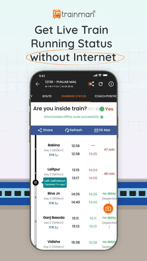 You can check the status of your tatkal booking, and your 10-digit PNR number, which is printed on your ticket using the Trainman app. Get detailed analysis of coach position, live train status, train routes, train departure time, and train arrival time.