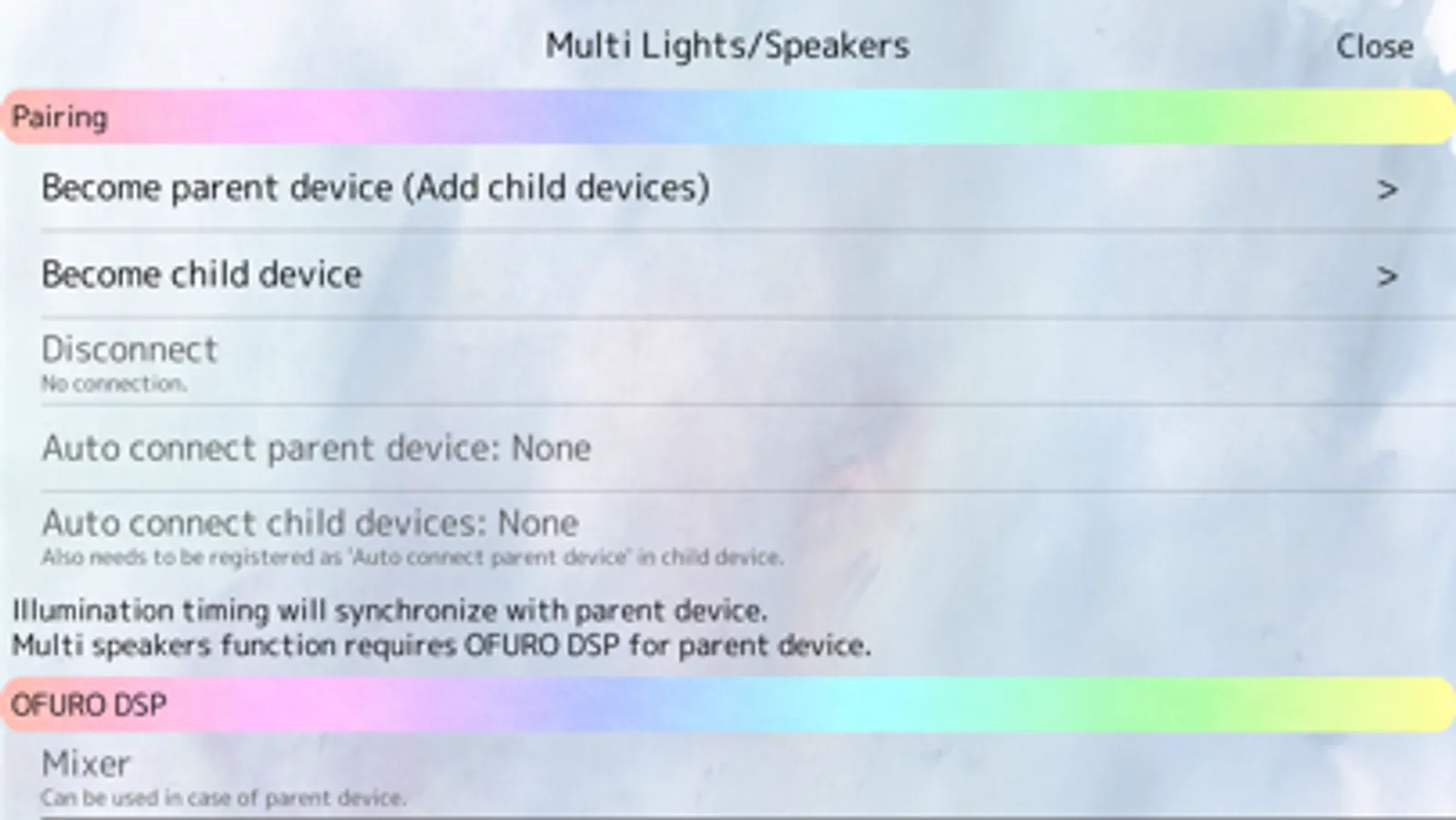 ・Tap upper left button of the illumination screen, then select 'Become parent device' or 'Become child device' and connect (automatic connection can be chosen from next time).