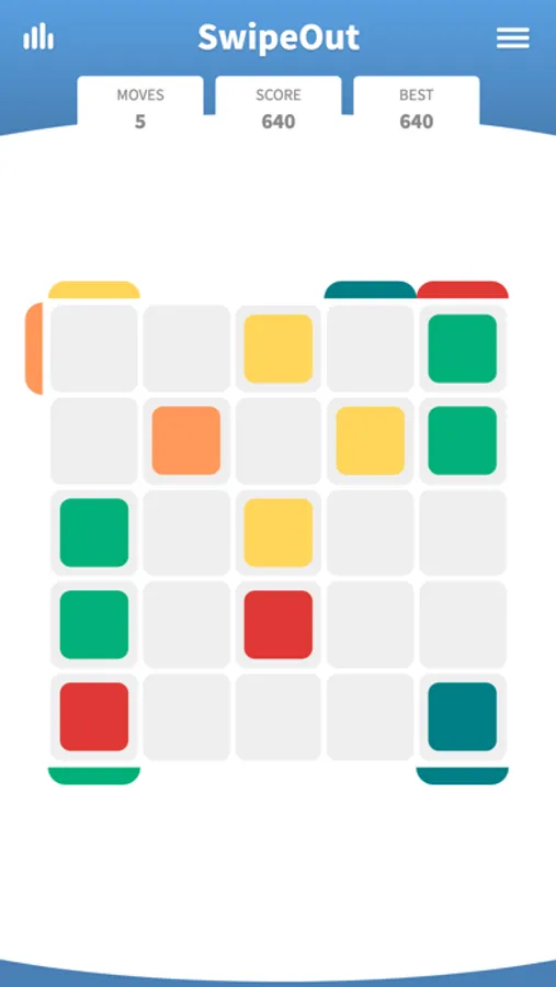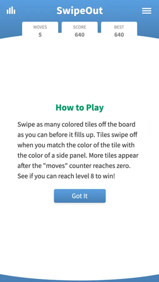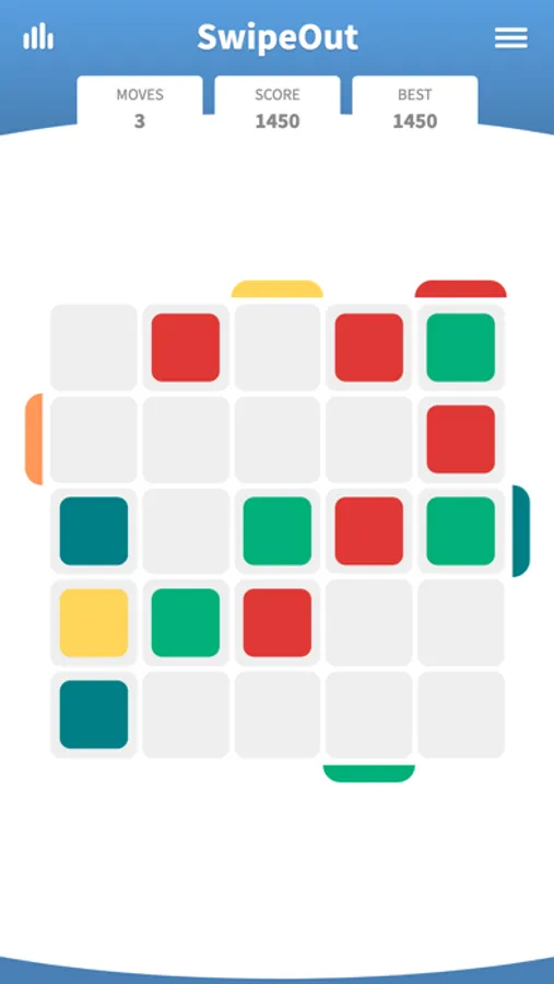 The goal is to swipe off as many colored tiles as you can from the board. Colored tiles can only be swiped off through their same colored side panels. More tiles appear after the moves counter reaches zero so be mindful and strategic with your swipes. Each time you swipe a tile off the board your points go up. The higher your score, the harder it gets! Hone your strategy and keep the game going for as long as you can to increase and maximize your score. See if you can reach level 8 to win!