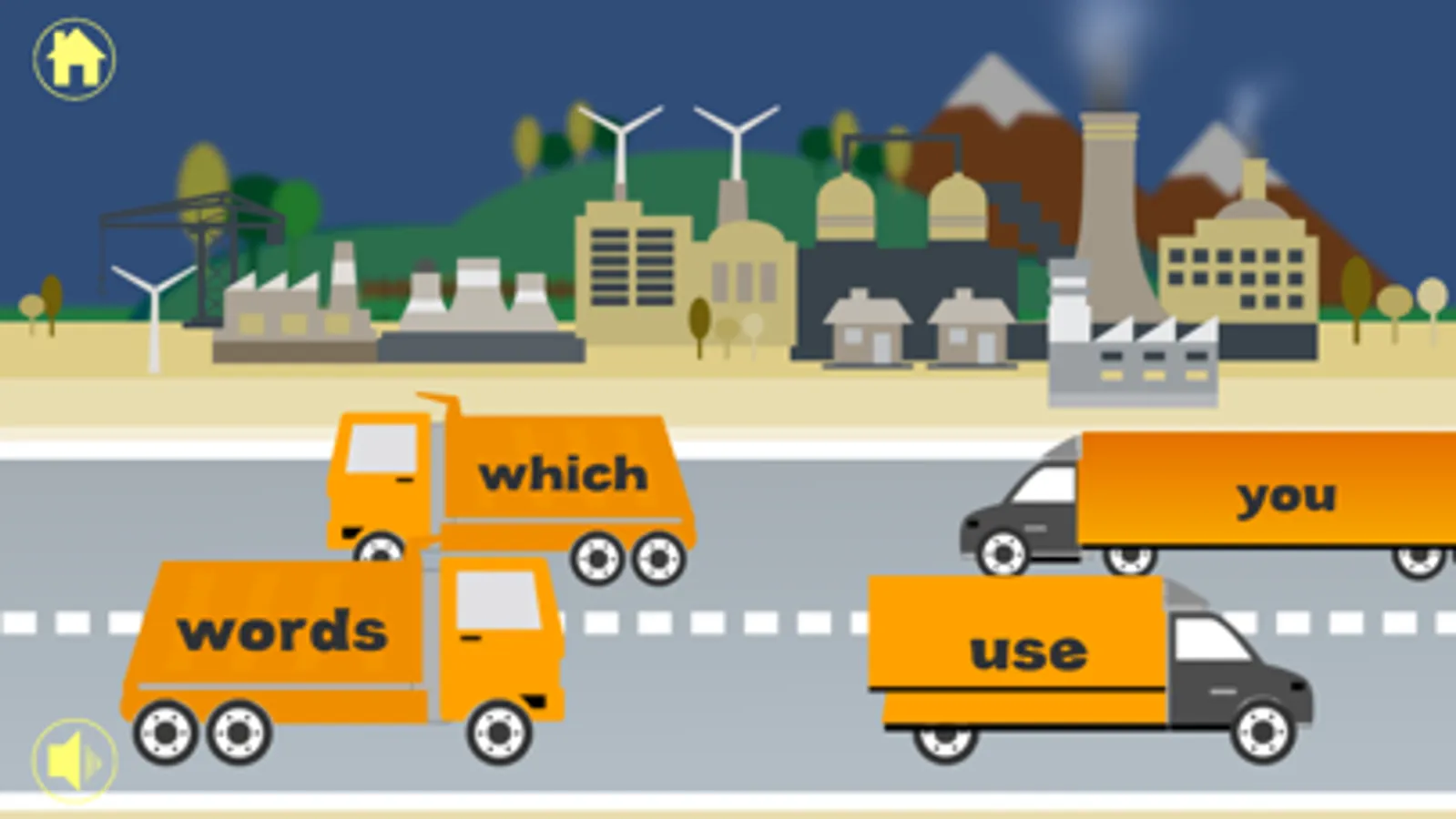 Reading Highway - Trucks drive through carrying words. Status bar displays a sparkling star for each correct answer.