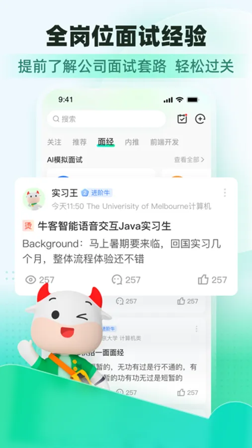 面试备战秘籍:看面经!汇集上万面试经验干货,前辈亲身经历教诲。更有AI模拟面试系统,带你充分演练备战,面试不再怯场。