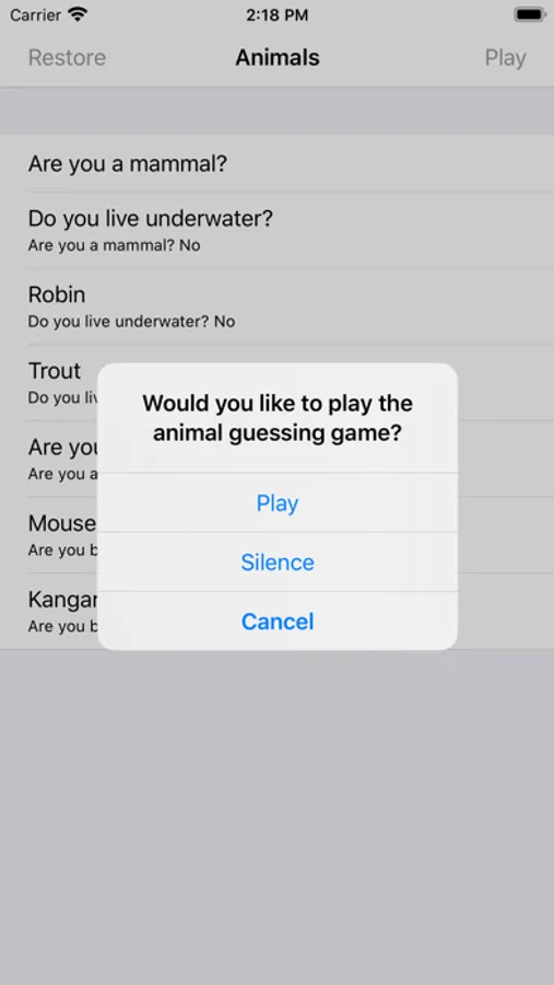 Animal guessing game! You can teach it how to guess what type of animal you are.