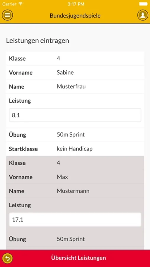 Finalisieren Sie die Eingabe immer durch Klick auf den gelben Button “Leistungen eintragen” Dieser Button erscheint unterhalb des/der letzten Teilnehmers/Teilnehmerin innerhalb des Eingabefensters.