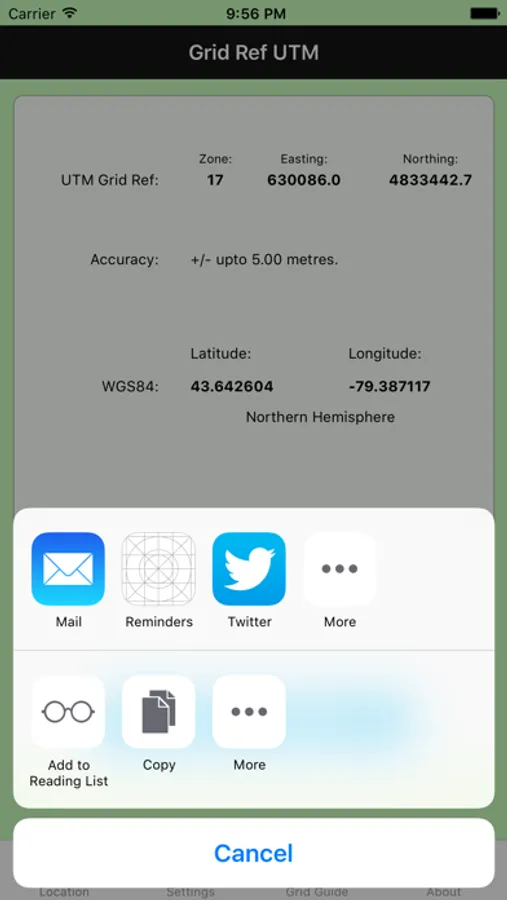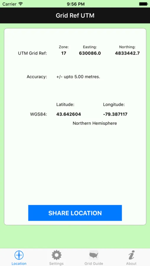 App Provides: UTM Grid Ref, Hemisphere, and WGS84 Latitude and Longitude values.