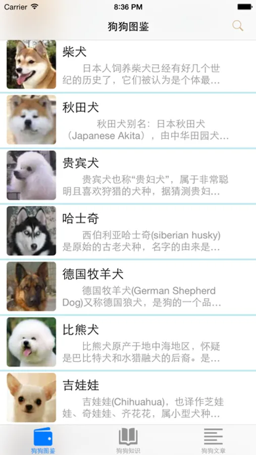 1、狗狗图鉴,共150多种狗狗种类,图文并茂,让你对狗种类有深入的了解,用户可进行关键字搜索,方便用户查阅