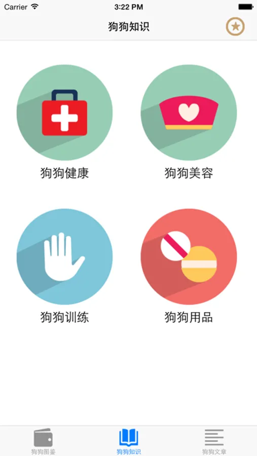 2、狗狗知识,分类四大类:狗狗健康,狗狗训练,狗狗美容,狗狗用品,让你了解更多狗狗知识,增进对狗狗的了解,并可以对文章进行收藏,复制等操作