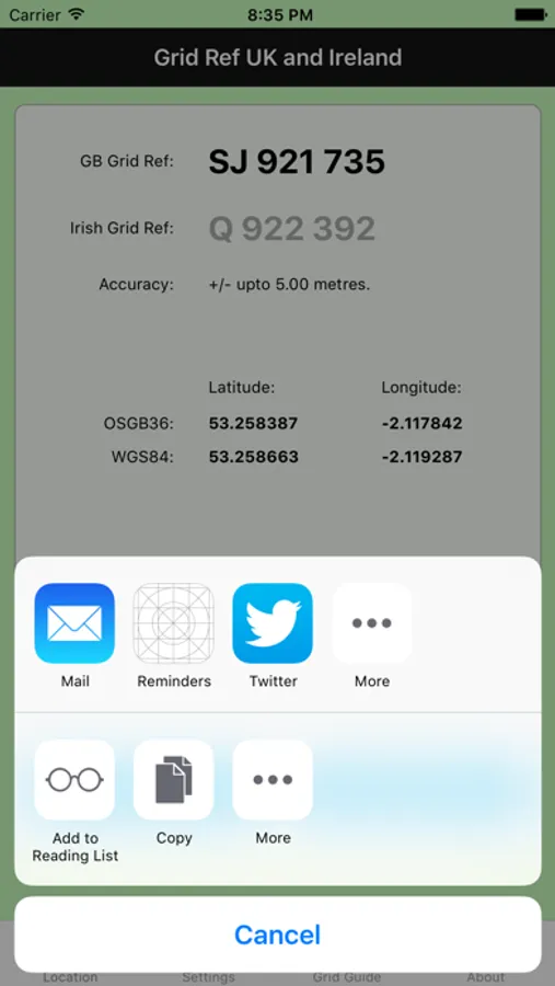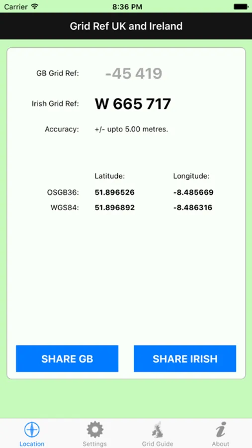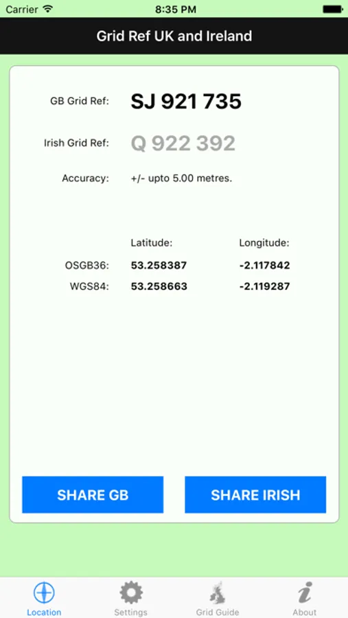 App Provides: GB Grid Ref, Irish Grid Ref, OSGB36 and WGS84 Latitude and Longitude values.