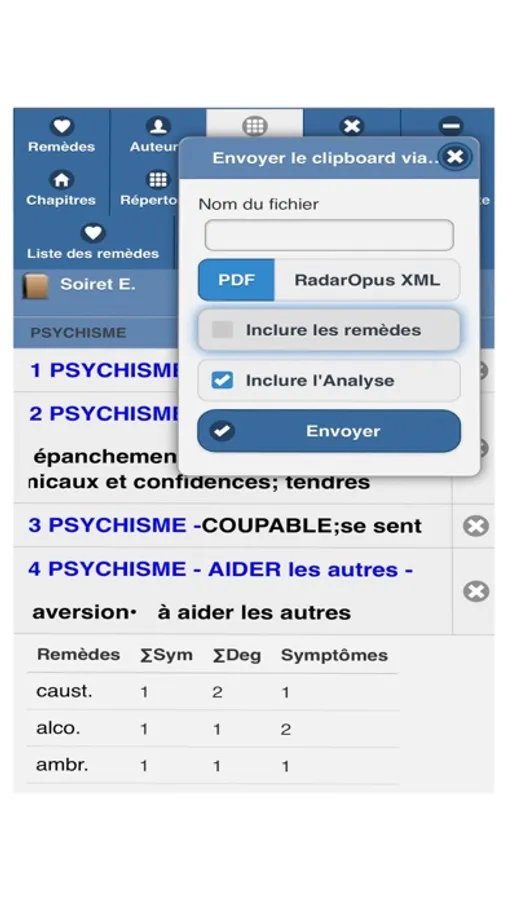 • Envoyez le contenu du clipboard par email à votre programme RadarOpus d’où vous pouvez le répertorier en utilisant d’autres méthodes d’analyse, comparer des remèdes et résultats et l’enregistrer dans le fichier patient.