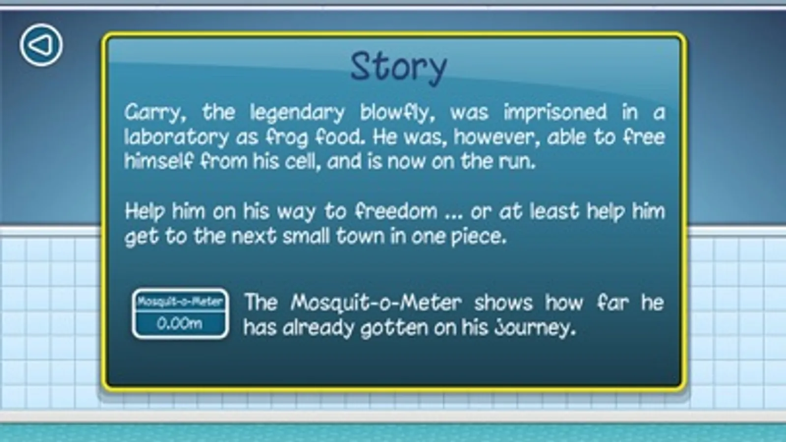 Garry, the legendary blowfly, was imprisoned in a laboratory as frog food. He was, however, able to free himself from his cell, and is now on the run. Help him on his way to freedom … or at least help him get to the next small town in one piece.