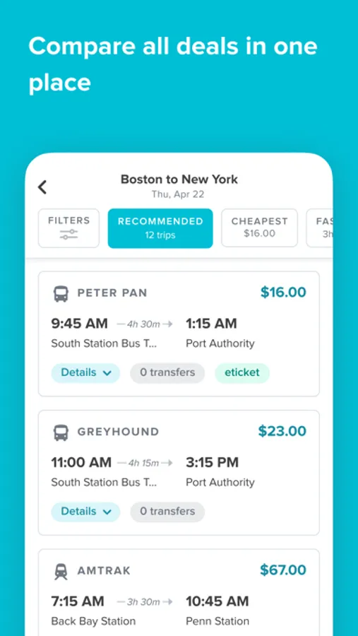 • Compare deals – Sort, filter and compare bus and train trips from hundreds of carriers in one place.