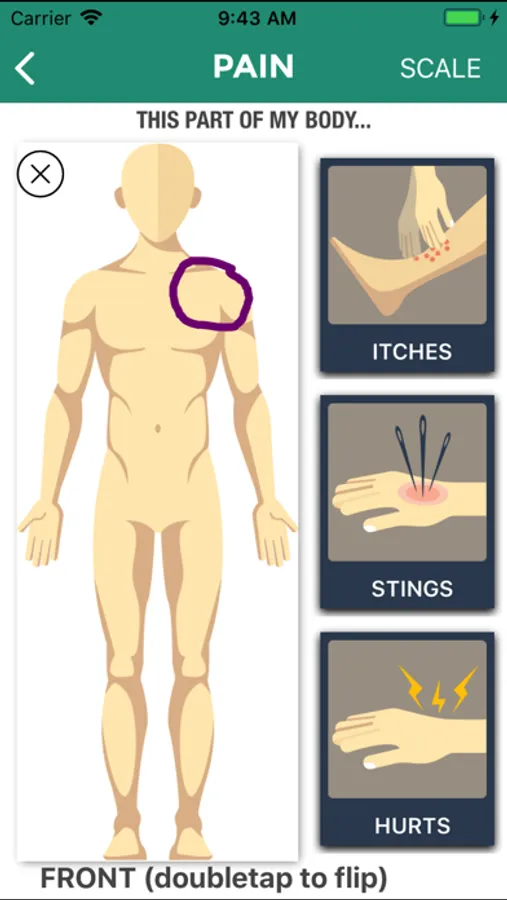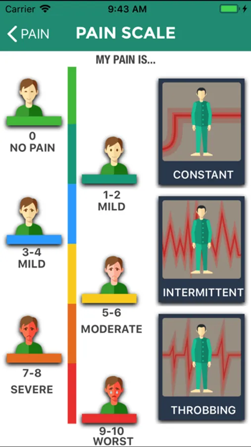 - Draw with finger to show pain area and speak out pain level and intensity.