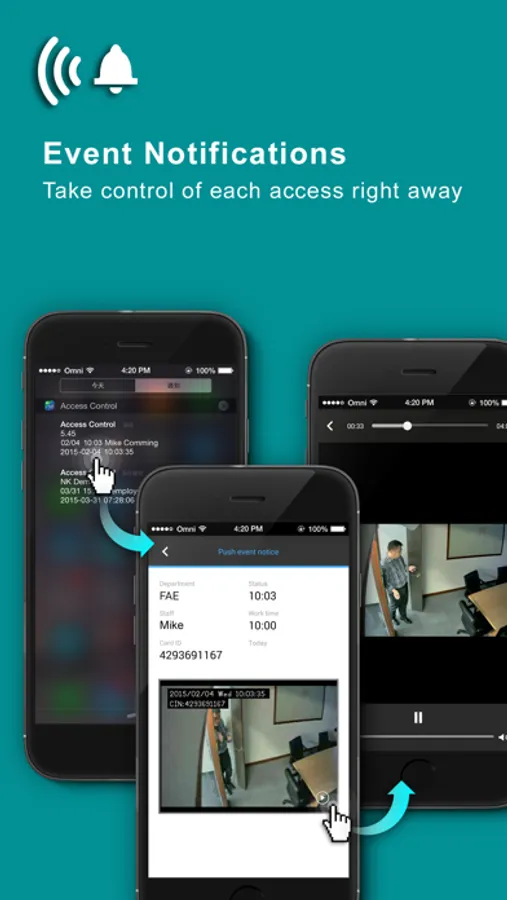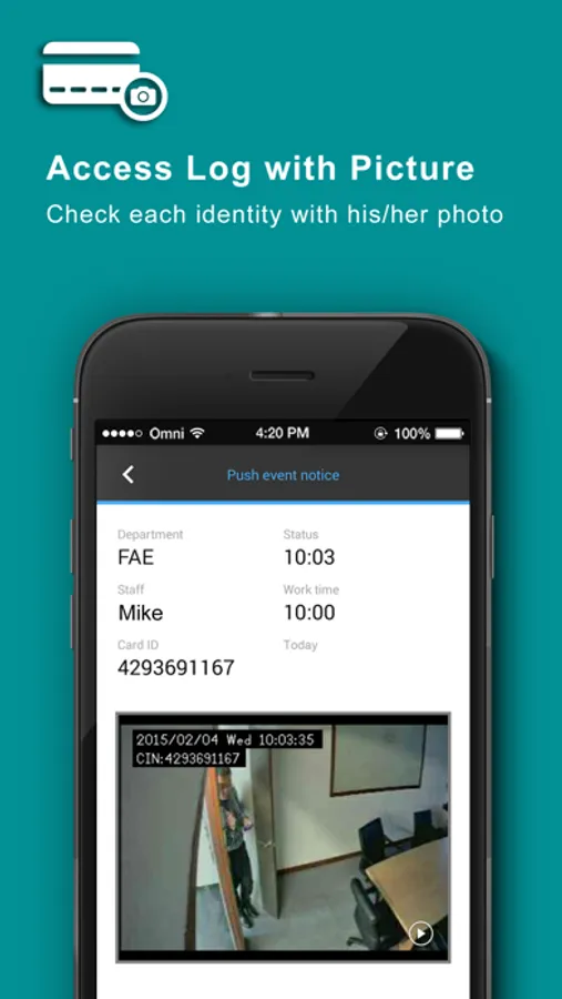 This function shall work with AVTECH's camera and recorder. The recording starts and lasts for the pre-defined time when the access card is read. At the same time, the manager will be notified of this incident. He could then review the access logs, play the video footage directly on his iOS device if needed to determine his next action (such as call the police or let it go).