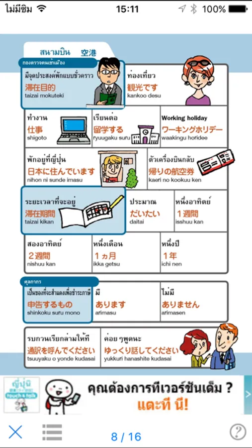 มีทั้งคำศัพท์ และวลีที่จำเป็นรวบรวมไว้อยู่ทั้งหมด 5 สถานการณ์ ตั้งแต่การออกเดินทาง การรับประทานอาหาร จนไปถึงการท่องเที่ยวในที่ต่างๆ
