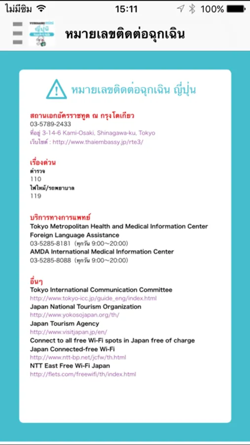 มีการรวบรวมหมายเลขติดต่อในกรณีฉุกเฉินไว้ซึ่งเป็นประโยชน์ ณ เวลานั้นๆ ไม่ว่าจะเป็น สถานทูตในญี่ปุ่นของแต่ละประเทศ สถานีตำรวจ โรงพยาบาล เป็นต้น