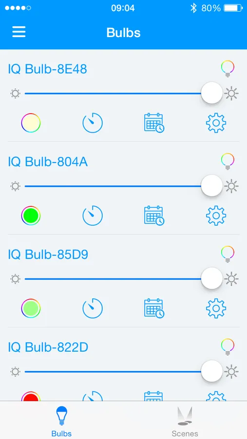 Using the app, turn the bulbs on and off, dim and brighten them, and change the color. Set a timer for the bulb to turn off, or set a schedule for the bulb to turn on or off at certain times of the day, at any color. Bright blue-white is useful for working or studying, warm yellow facilitates relaxation, while the different colors are a good match for holidays and celebrations, watching movies, or even as a night light.