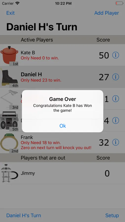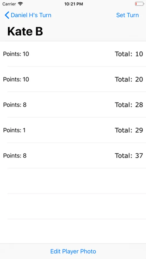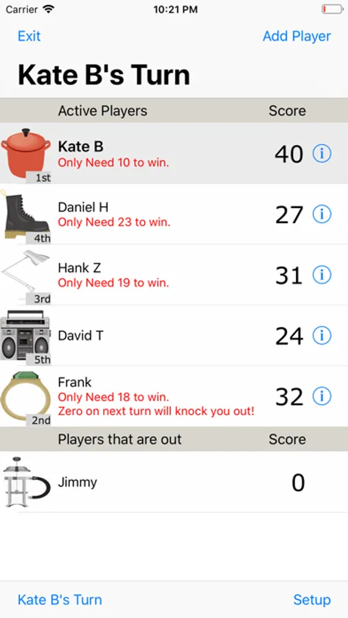 2. Keep track of the score by selecting the name then selecting the points. The app will automatically add up the scores,keep track of player order and player rank