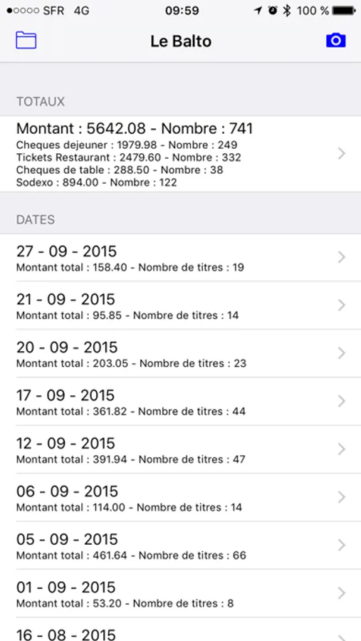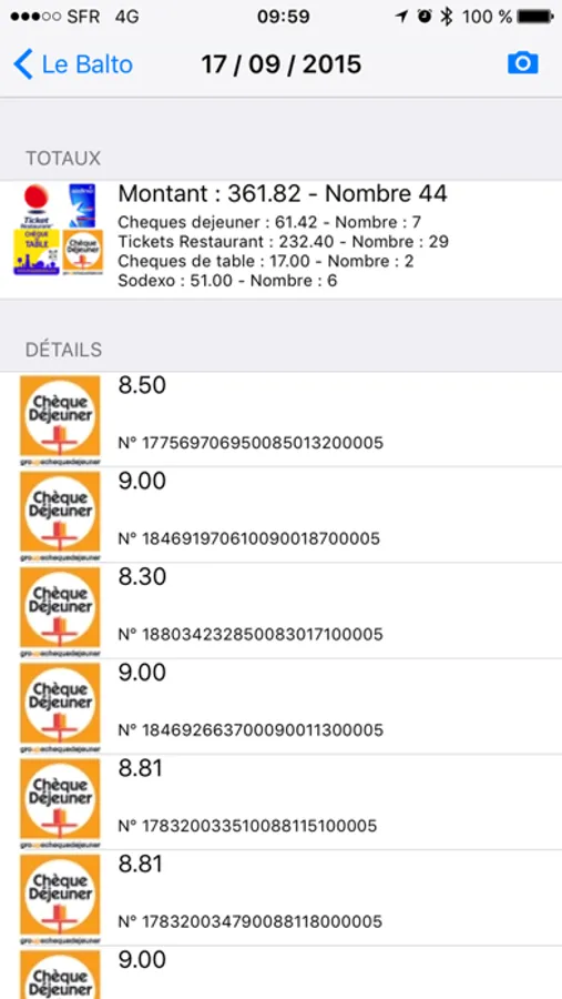 Vous aurez accès au cumul des montants globaux et pour chaque jour, ainsi que du nombre de titres par type (Chèque Déjeuner, Sodexo/Pass Restaurant, Chèque de Table, Tickets Restaurant).
