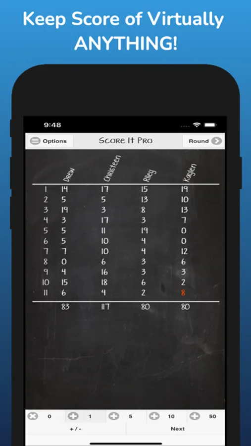 Score It Pro allows you to quickly and easily keep score for virtual any game. It’s a digital scorecard that’s always in your pocket. No more hunting down a pen and paper to keep track of your scores.