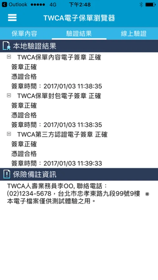 Here displays validation results of this e-policy. Legitimate e-policy should include three electronic signatures. If you see any error message, please contact your insurance agency.