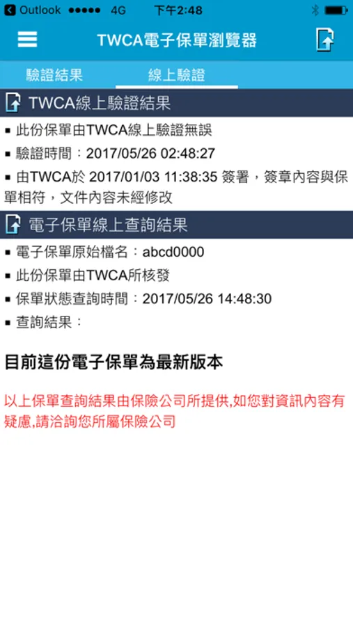 If you want to re-confirm the reliability of e-policy content, any time, please click the upload bottom at the right top. TWCA will verify this e-policy again online and displays the updated status. This service is free. If you see any error message, please contact your insurance agency.