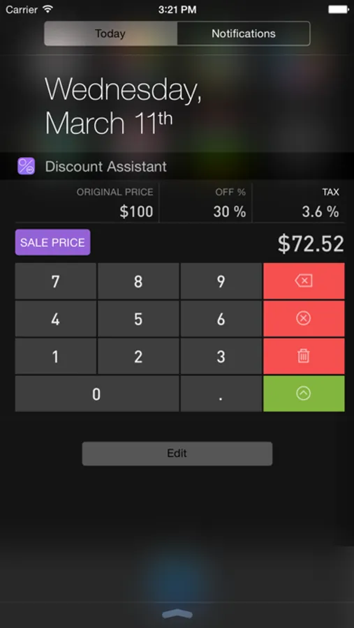 Discount Assistant also has Today widget which can be enabled in Today view of Notification Center. Then you can quickly access all the functions without opening the main app.