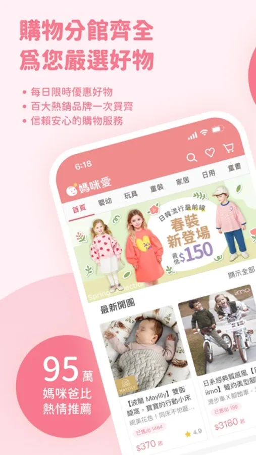 *懷孕待產包、嬰兒用品、寶寶副食品、玩具童書、童裝、幼兒園用品、親子旅遊、生活日用、安心食品⋯⋯媽咪愛幫您嚴選給寶寶和全家人的好物,並提供最划算的限時優惠。