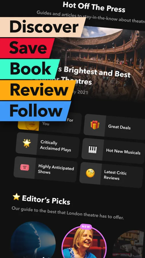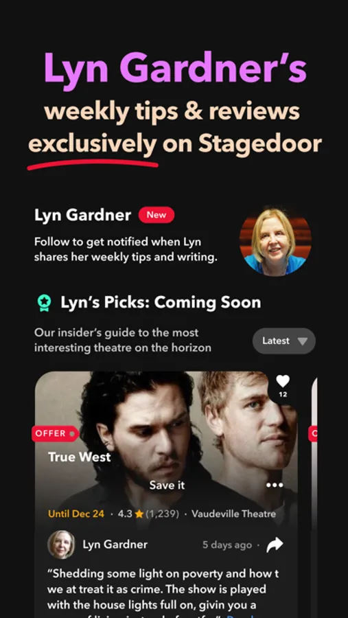 Featured by Apple, Stagedoor is the best way to discover London theatre’s hidden shows. Algorithms sift through every show in London, to find the perfect theatre show for you. Booking theatre tickets is a breeze with Apple Pay. That’s why Stagedoor’s community of theatre-goers never miss out on the next best show!