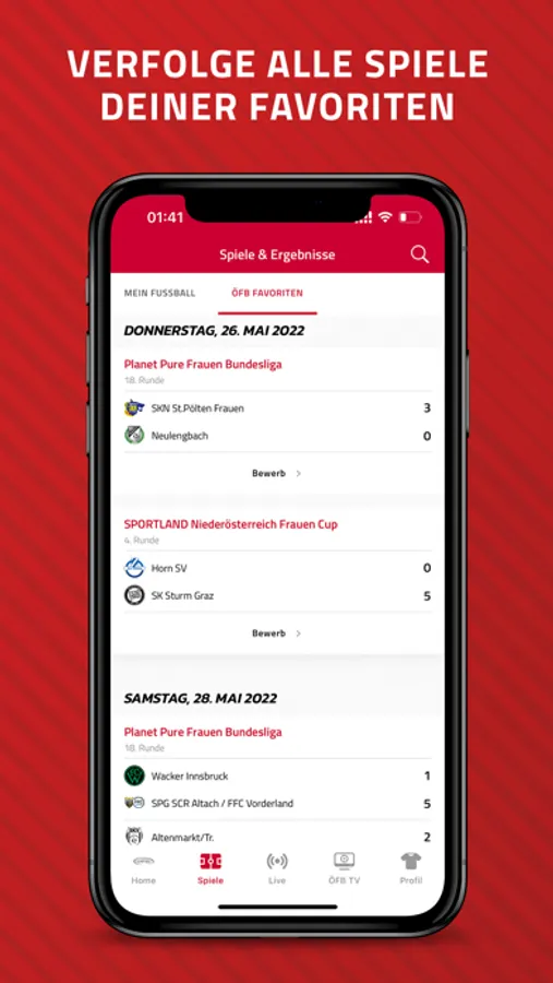 Bei allem Neuen war es uns stets wichtig, die Basis nicht zu vernachlässigen. Daher beliefern wir dich weiterhin mit allen Ergebnissen, Tabellen und Statistiken von der ADMIRAL Bundesliga bis zur 2. Klasse Marchfeld. Die ÖFB App ist dein Tor zum rot-weiß-roten Fußball. Mittels Favoriten-Funktion kannst du zudem deinen Lieblingsteams, deinem Enkel, deiner Nichte oder deinen besten Freund:innen folgen, und sie für Siege und Tore feiern.