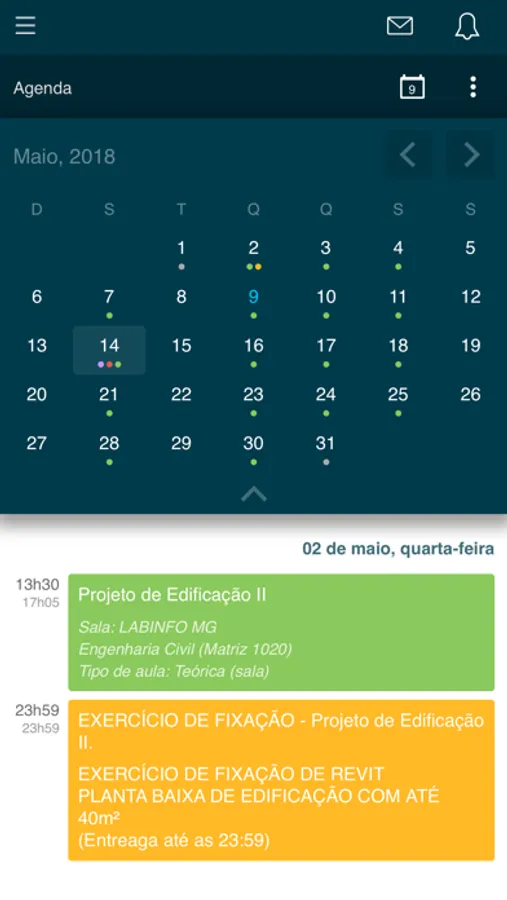 - Agenda com horários de aulas, datas de provas e trabalhos;