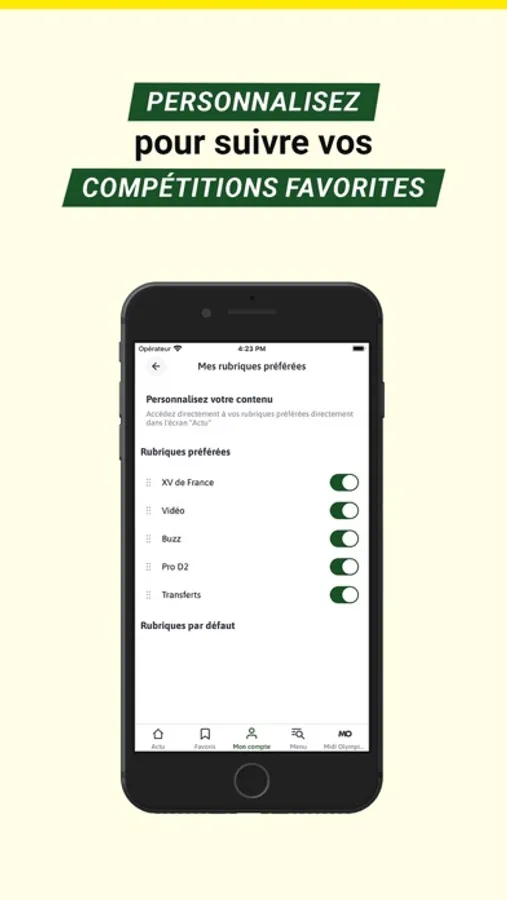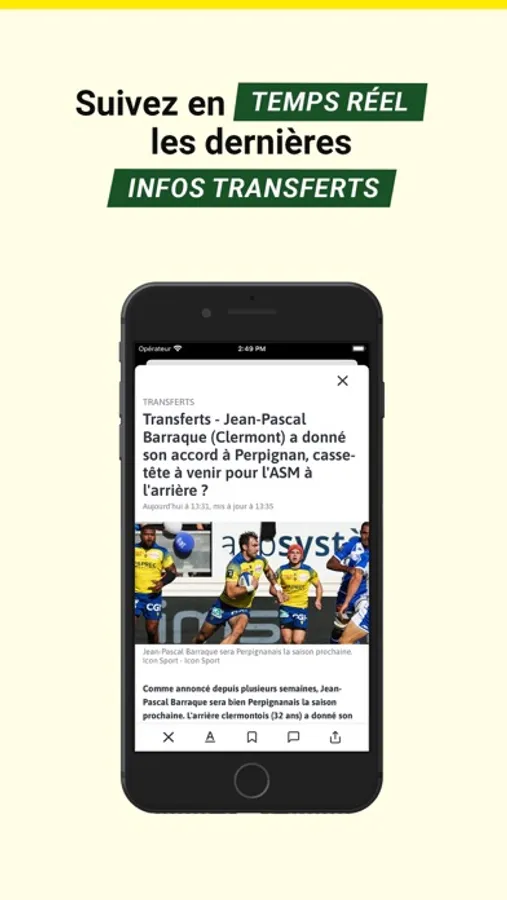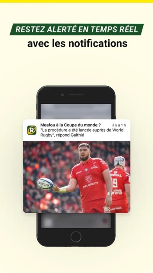 - Recevez des notifications personnalisées en fonction de vos préférences : XV de France, Top 14 (Stade Toulousain, RCT, Stade Français…) , Pro D2, Amateurs, Transferts, Grandes compétitions, Internationales, Coupes d’Europe