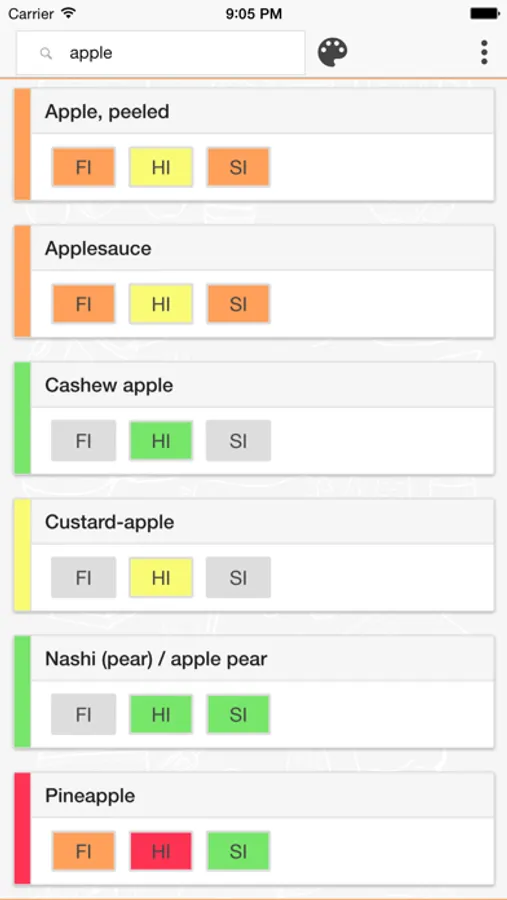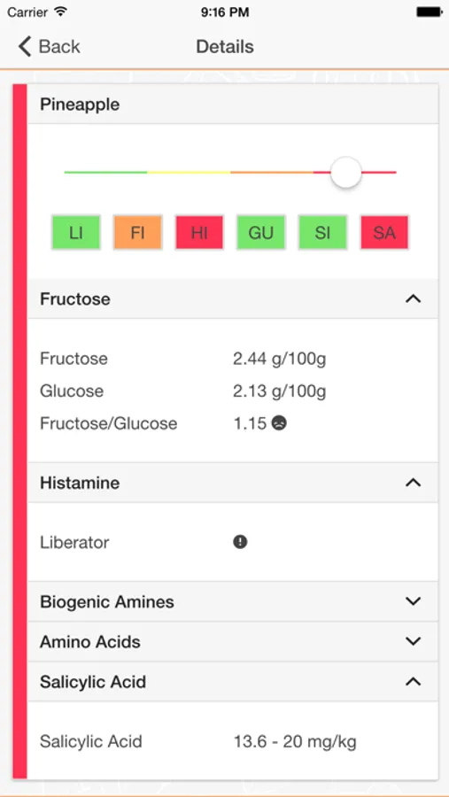 Search quickly for a specific food, browse certain categories such as beverages, fruits, dairy products, etc. or filter compatibilites by color. In addition, ALL i CAN EAT does also provide many details such as the amounts of lactose, fructose, glucose, histamine, sorbitol, salicylic acid, amines, amino acids, etc. And in case you should miss a food, you can add it easily.