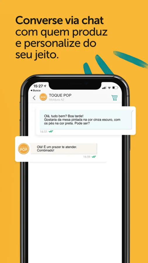 - Acompanhe a entrega dos seus pedidos via notificações e mensagens diretas com o vendedor enquanto o seu pedido é produzido.