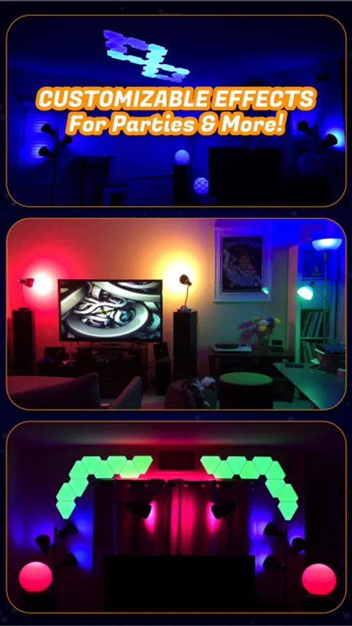 MUSIC VISUALIZER: Create the ultimate music listening experience. The app listens to your music and changes the effects based on the mood of the song. Lights get active during intense parts of a song and flowy with softer melodies and magically change colors at just the right moment. Special controls for Nanoleaf allow you to control rotation and fill angle to match your Nanoleaf panel orientation.