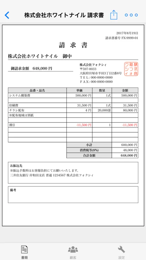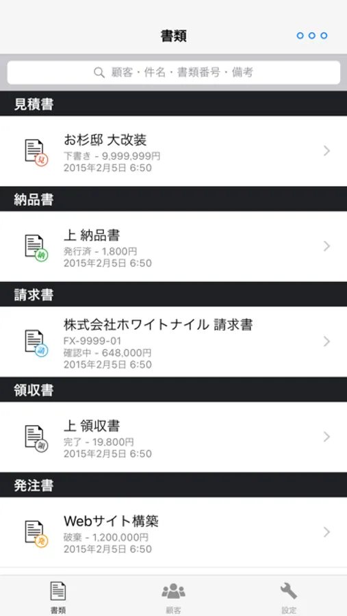 顧客リストの他に顧客別の書類表示や、顧客情報の自動入力された書類を作成可能!