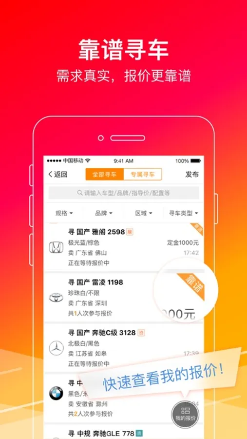 2、在线寻车,快速发布普通/靠谱寻车,牛牛汽车会将您的寻车信息推送到合适的供应商,卖家也可以直接参与竞价报价,双方价格更真实有效,电话接不停!