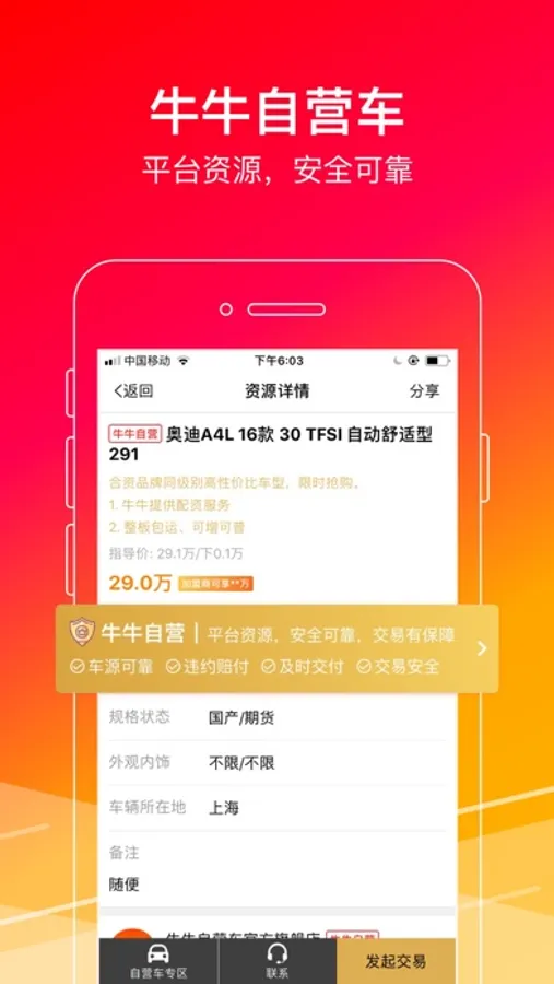 3、发布车源,轻松发布自家车源,买家可选择在线交易,双方定金通过牛牛汽车平台支付,操作安全快捷。