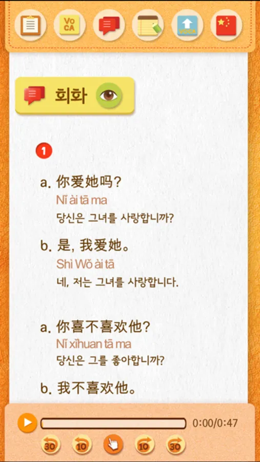 1. 새단어, 회화, 어휘 업그레이드 학습 시 문장을 누르면 바로 발음을 확인할 수 있습니다.