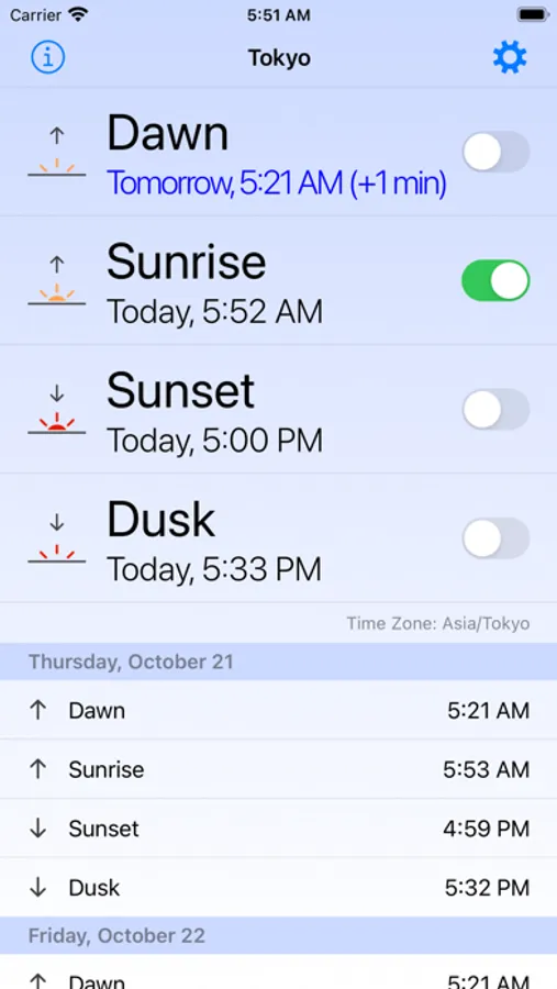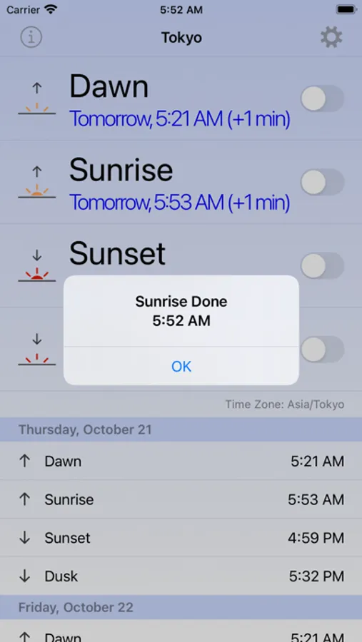 This app is an alarm that notifies at dawn, sunrise, sunset, and dusk. If you would like to begin activities soon after sunrise, the app is most suitable. The app can confirm sunrise, sunset, dawn, and dusk on a current position and main cities immediately. And you can check the time of dawn, dusk, sunrise, and sunset even if you do not allow local notifications.