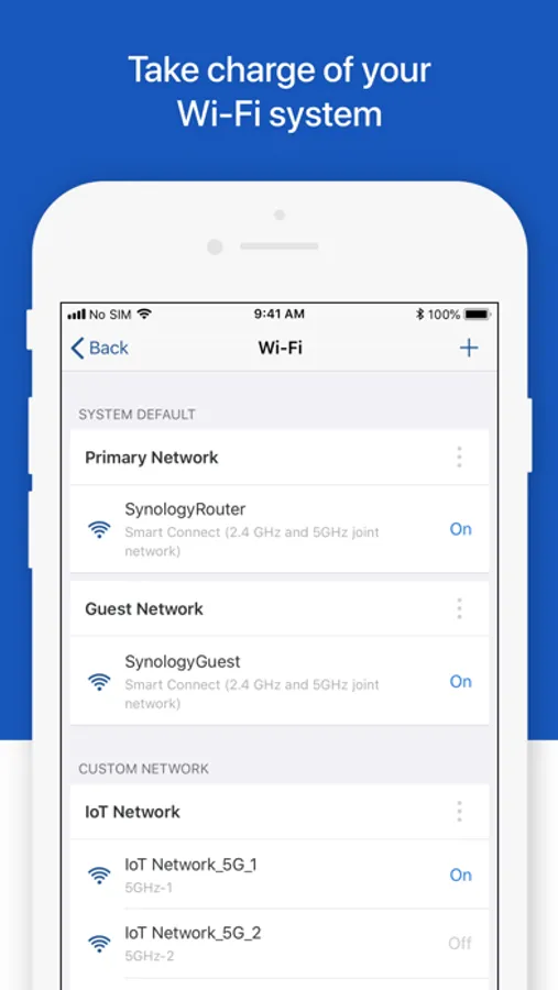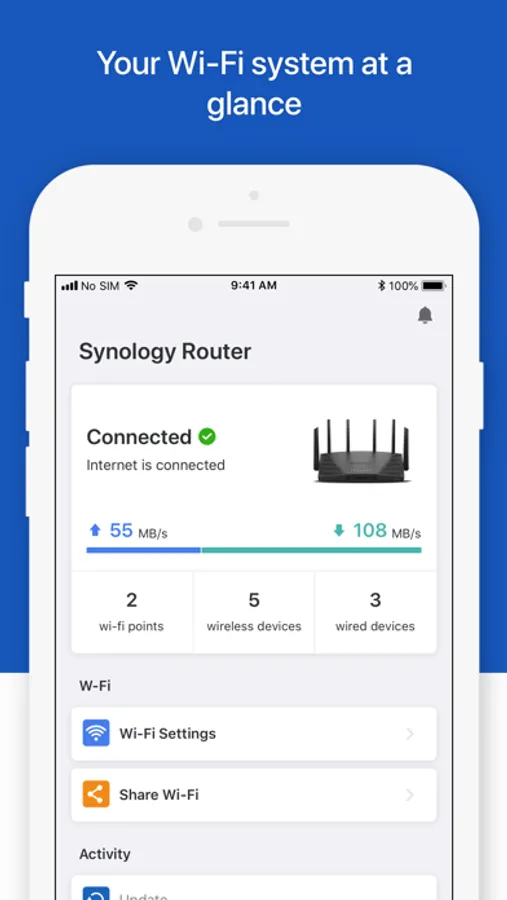 DS router allows you to manage you network with just a few taps whenever you want, wherever you go. Easily set up brand new Synology Routers, monitor live traffic, and protect your children's Internet activities with the comprehensive features of DS router.