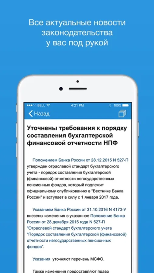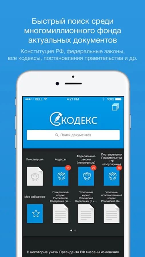 КОДЕКС позволит работать с более чем 17 000 000 актуальных и постоянно обновляемых документов, включая Конституцию РФ, все кодексы, популярные федеральные законы, новости законодательства, а также другие нормативно-правовые и нормативно-технические документы.