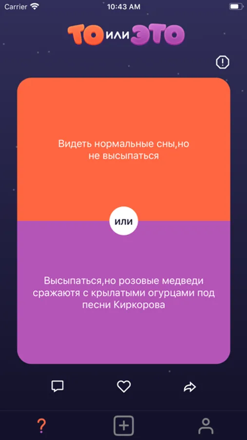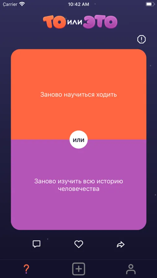 «То или Это» — игра, в которой пользователи отвечают на интересные вопросы и предлагают сделать непростой выбор другим. Вы решаете, какой из двух вариантов подходит именно вам, и голосуете за него.