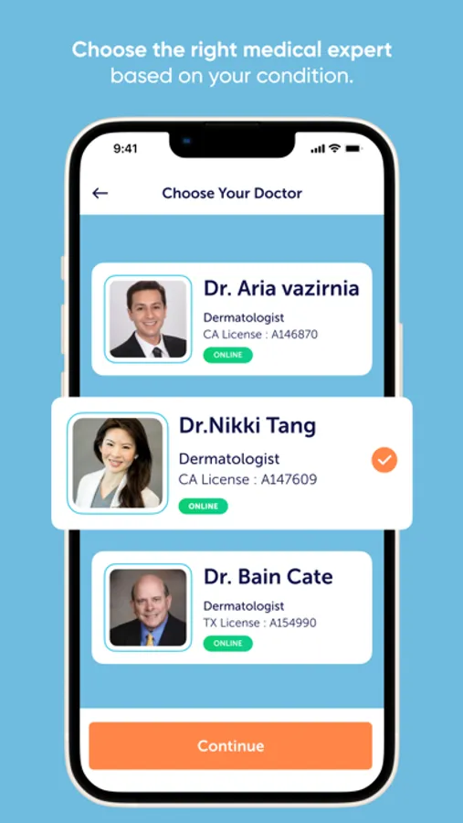 1. Download the app (for free) and connect to your dermatologist or primary care doctor. Tell us where you live by entering your zip code, and we will recommend you a doctor, or you can also select any doctor from the wide range of options available, who are licensed to practice in your home state.