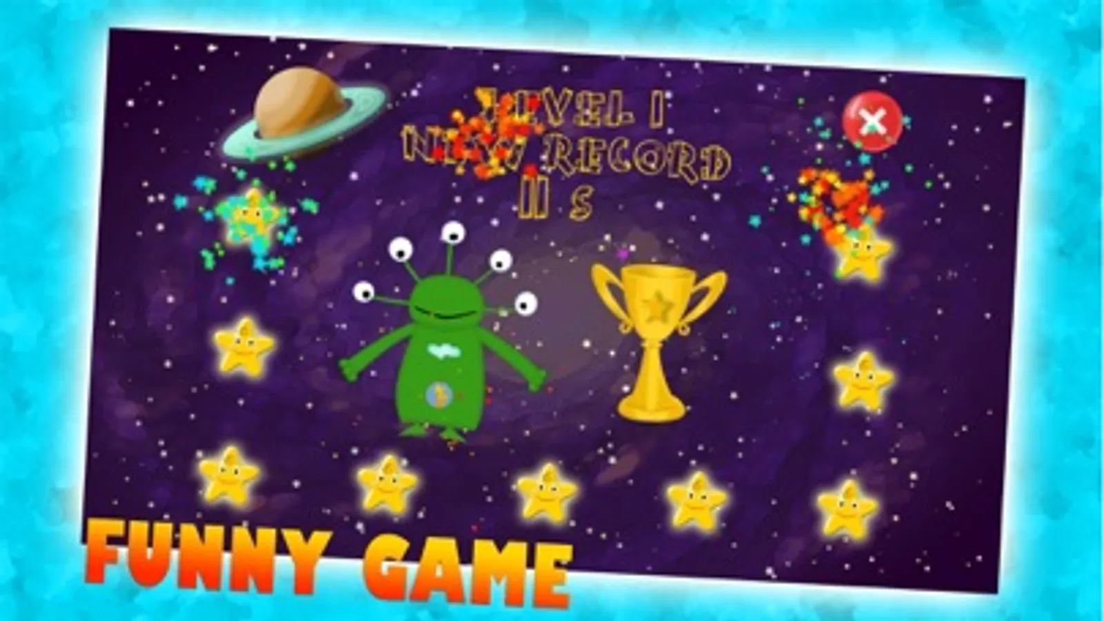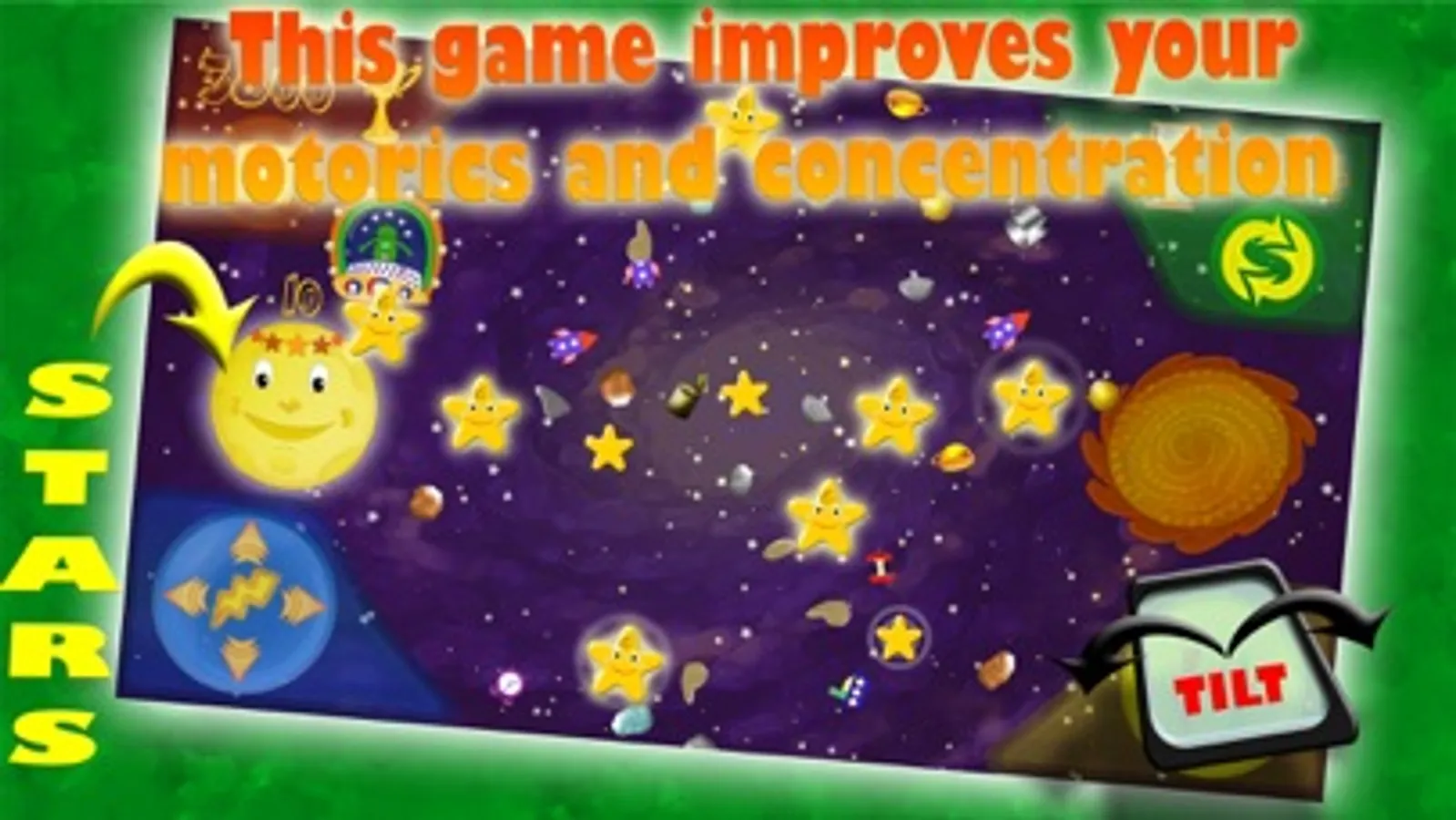 The game is controlled by tilting of the device. The goal is to catch all the flying stars in the galaxy. You have to fly with the UFO near the shinning star, take it (yellow button) and then give it to the moon on the left side (yellow button). If you catch the space debris, you have to put it into the black hole on the right side.