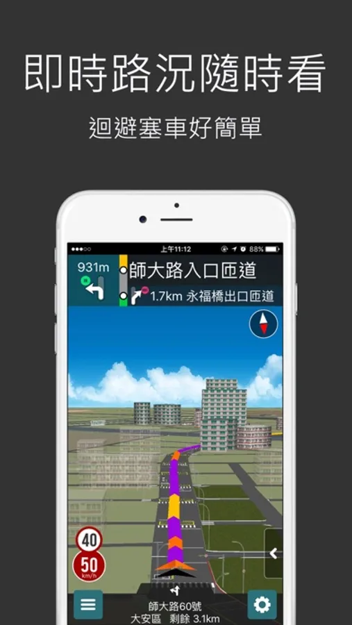 ● 導航沿途路段以紅、黃、綠顏色標示交通狀況,用戶可依路況研判行車路線。