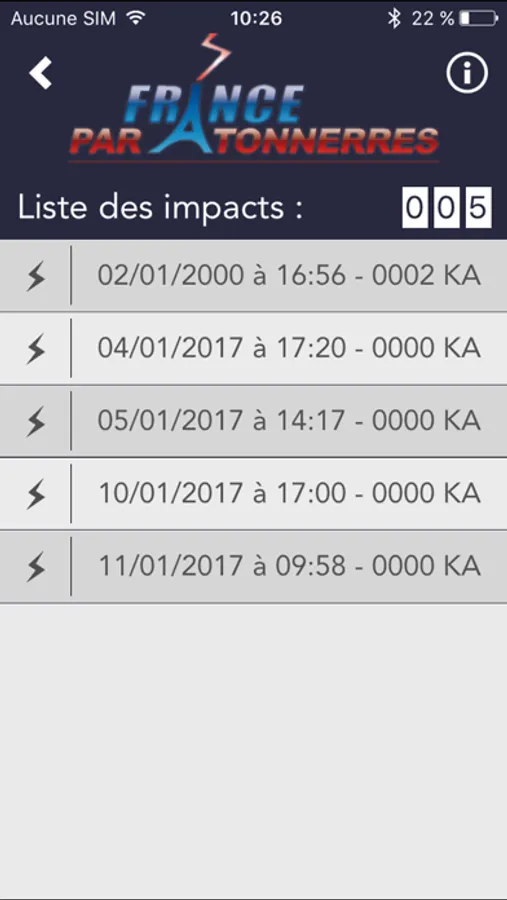 Vous pouvez alors connaître le nombre d’impacts reçus, ainsi que la puissance de chacun d'entre eux en kA, la date et l'heure à laquelle ils ont été enregistré.