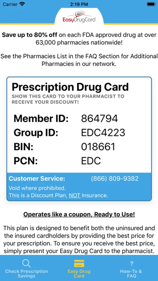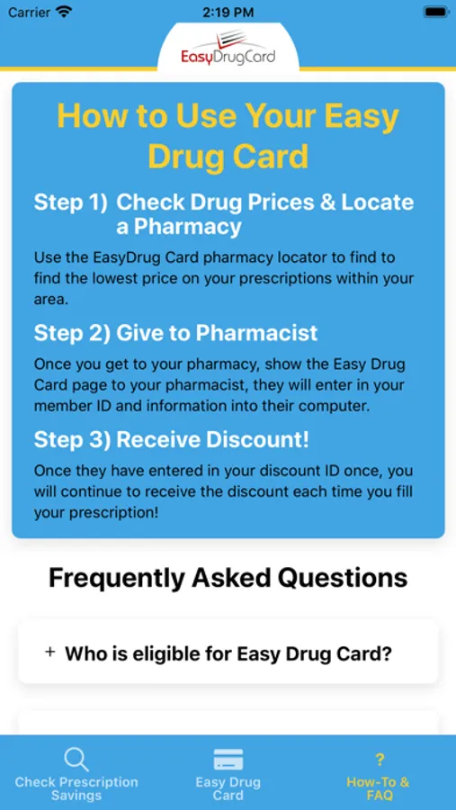 • Our app opens with a discount card you can take to your pharmacy for immediate savings on your prescriptions.