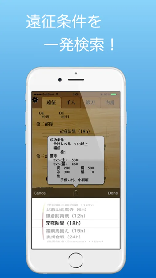 遠征情報(成功条件・獲得資材)を参照することが出来ます。