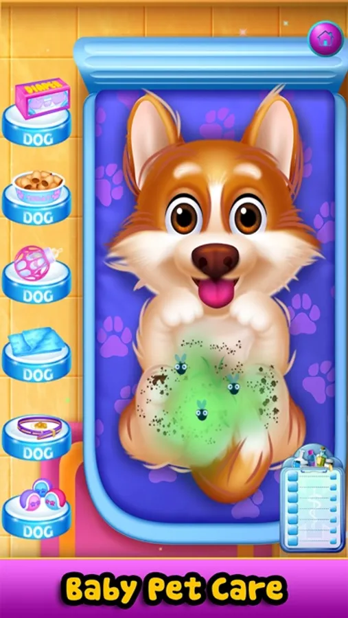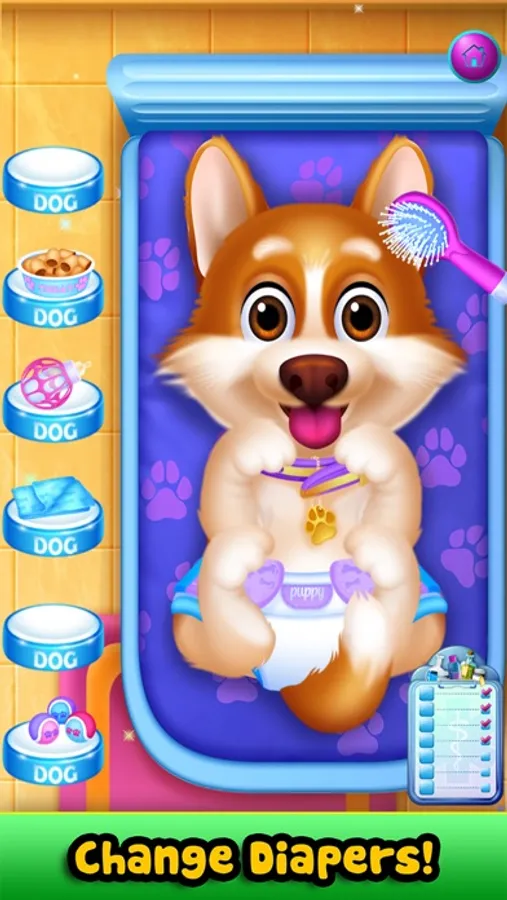 Level 5: Oh no! The pet puppy is messy! Help do puppy care and clean-up! What a cute new puppy! Bark! It's time to change diapers, brush hair, feed the treats & milk, put on collar and play with the ball!