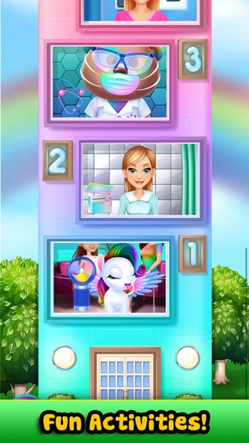 Level 1: Play & care for the baby pet unicorn!! Add unicorn horn & toy, give milk bottle, eat candy and use the stethoscope to take a rainbow heart beat!