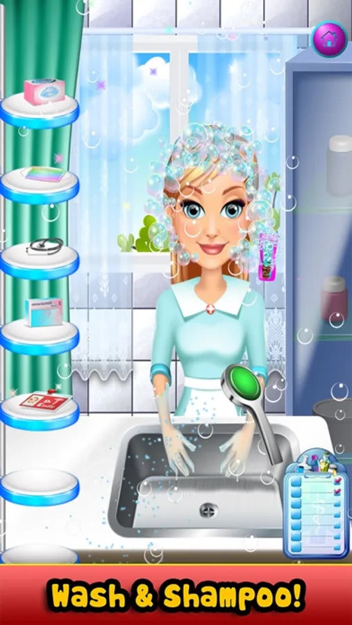 Level 2: Help clean up the messy doctor and wash hair! Use shampoo to wash green slime out of hair. Then rinse off with the water sprayer and add hats & gloves!!